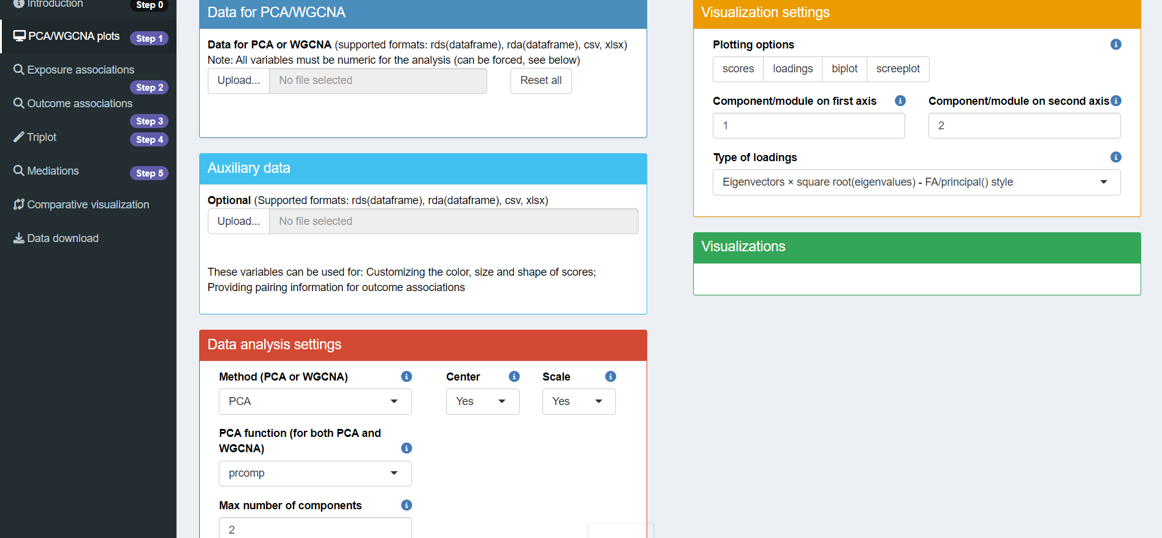 The first four steps, with their flexible options in analysis and visualization settings, are designed to help users explore their data and results. After experimenting in Steps 1-4, users should have formed ideas about what to include in their final analysis and figures (e.g., whether to perform confounder adjustment or not; whether to present risk estimates as beta-coefficients or odds ratios).