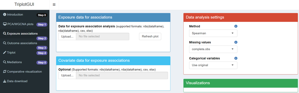 After uploading Omics and auxiliary data (optional) in Step 1, click “Exposure associations” in Step 2 on the sidebar. You will then see the layout as shown below.