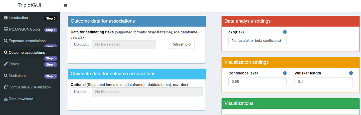 After uploading Omics and auxiliary data (optional) in Step 1, clicking “Outcome associations” in Step 3 on the sidebar will display the layout for this step.