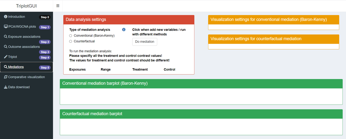Unlike previous steps that automatically perform corresponding analyses upon data upload or setting changes, users must manually initiate the mediation analysis by clicking the Do mediation button. This step is necessary due to the potentially time-consuming nature of mediation analysis, which is performed on each combination of exposure, mediator, and outcome.
