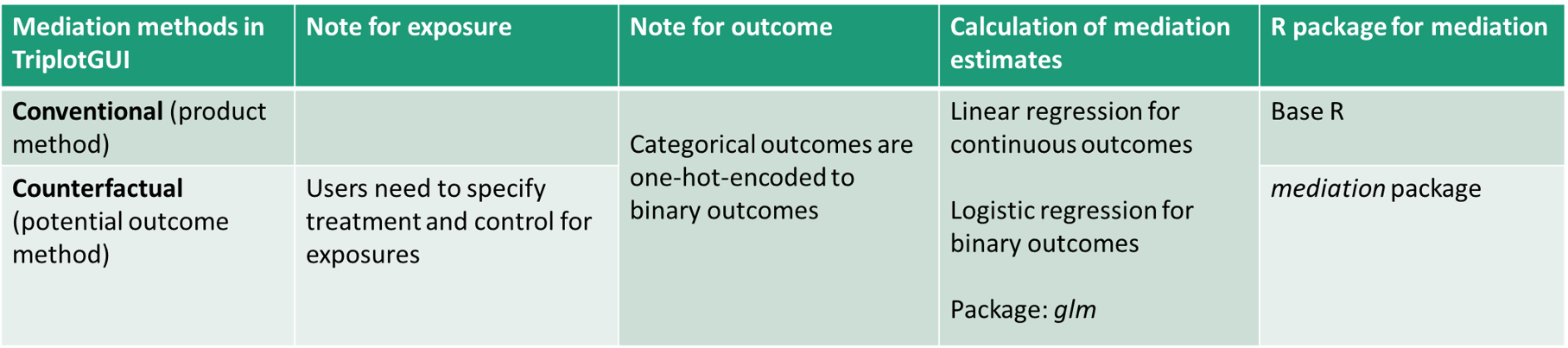 - Type of mediation analysis: Two options are provided, Coventional and Counterfactual. By selecting Conventional, mediation analysis based on the approach originated by Baron and Kenny will be performed, utilizing the product method. In contrast, selecting Counterfactual mediation analysis employs a potential outcome framework provided by the mediation package. Here is a summary of these two methods in TriplotGUI: